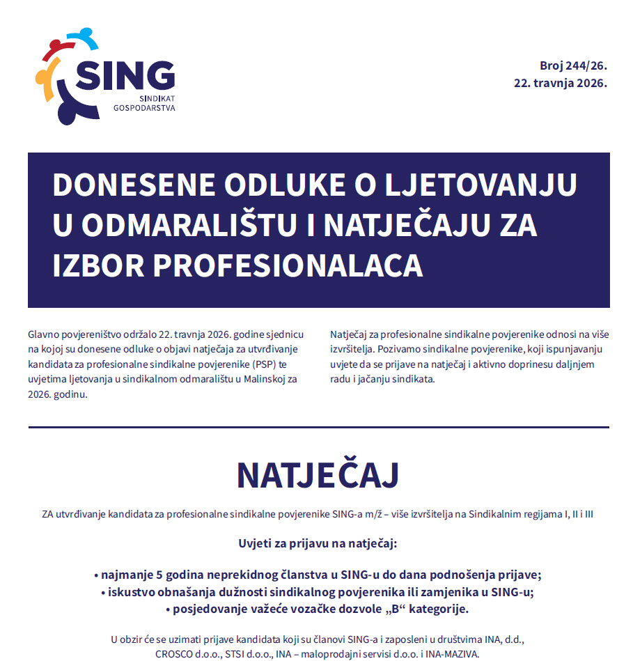 • SING - Raspisuje natječaj za utvrđivanje kandidata za profesionalne sindikalne povjerenike SING-a – više izvršitelja na Sindikalnim regijama I, II i III